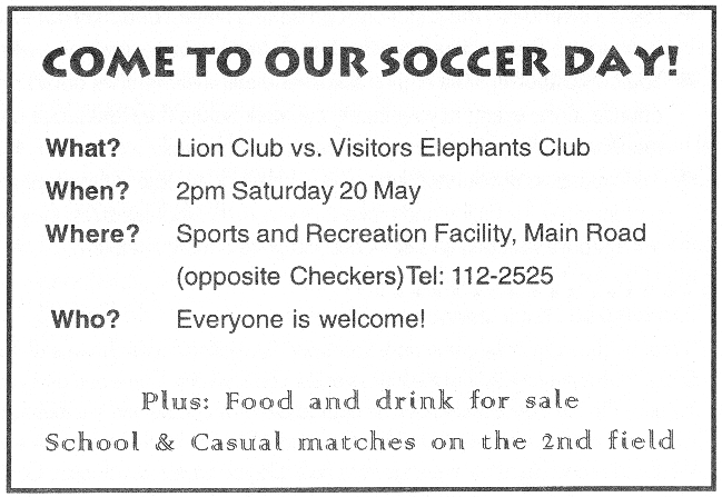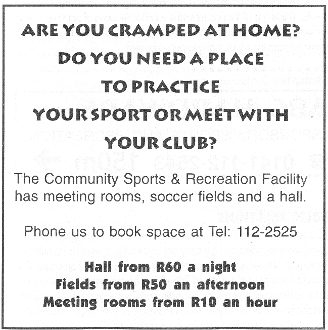 “What ‘s happening at the community Sports and Recreation Facility this week? The Soccer club is playing against the Visitors at 2pm on Saturday. Come and give your support! The ballroom dancing club holds practice on Monday and Wednesdays. Come along and meet people and learn to dance. Our two local choirs practice on Wednesday and Thursday evenings from 7pm.. Do you have a good voice. Come along and sing! Come and visit the Facility opposite Checkers on Main road or phone the facility at 112-2525 for more information or to list your club’s activities. Sports and Clubs are good for you and good for our community. Support the facility.